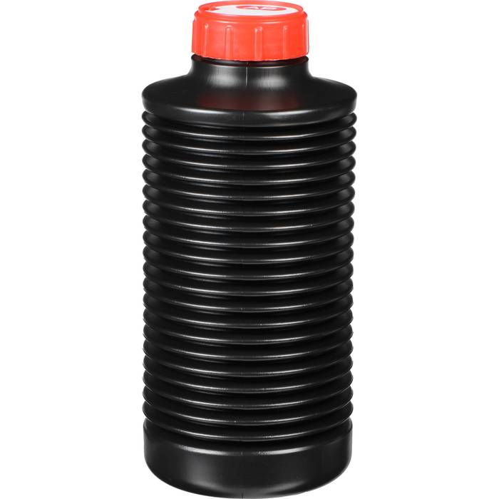 For photochemicals. Black. The accordion-like walls can be pressed together, setting excess air free. This reduces the danger of oxidation and allows for longer storage of chemicals. With screw-on cap.